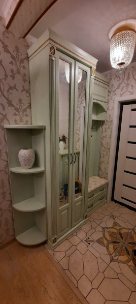 Прихожая из натурального дерева из серии Пальма, массив берёзы, цвет оливковый декорирован золотой патиной, мебель выполнена по индивидуальному проекту.