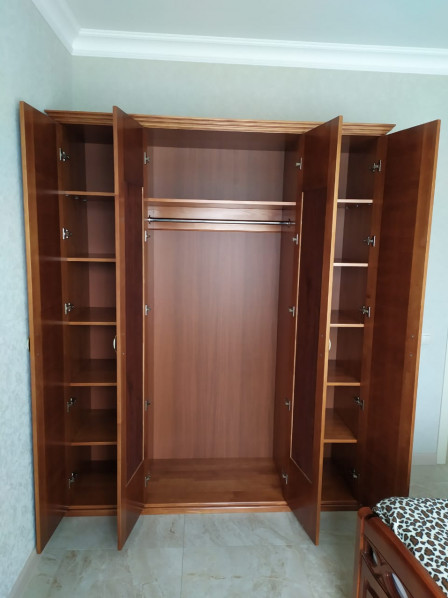Шкаф четырёхстворчатый из натурального дерева, массив сосны, цвет вишня 2, мебель выполнена по индивидуальному проекту.